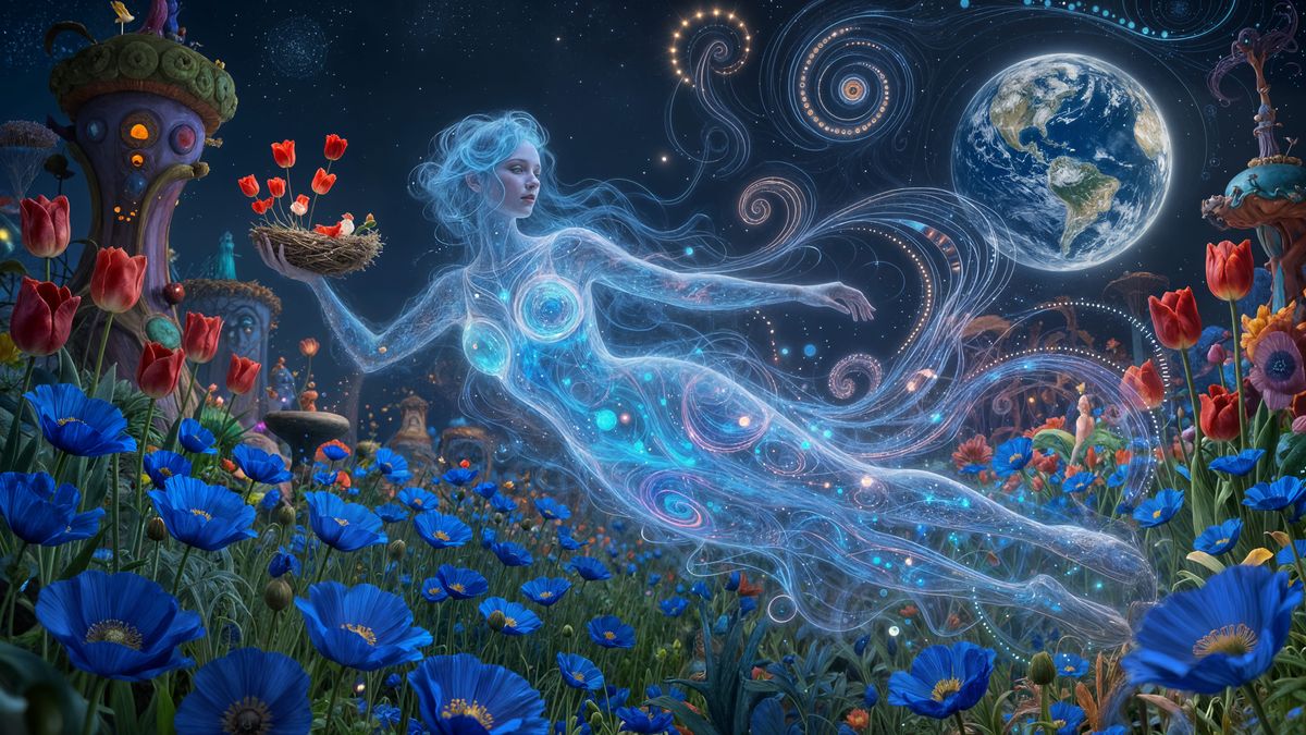 A mystical, dreamlike scene featuring a woman in cobalt blue floating gracefully among Himalayan blue poppies. The image evokes whimsy and wonder with glowing patterns and surreal architecture.