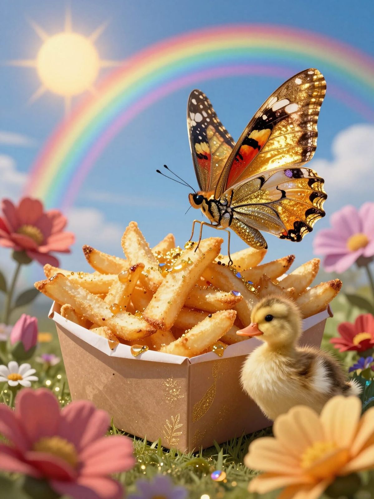 This image shows a detailed butterfly in glittery silk, enjoying fries near large flowers under a blue sky with a shining rainbow. Features exceptional sharpness and HDR quality.