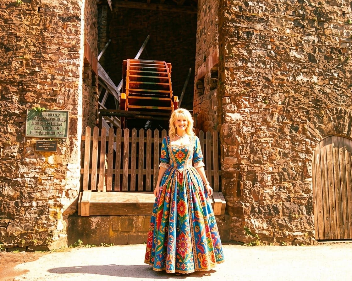 A happy, colorful image of a smiling woman in 1965 fashion standing by a large water wheel. The image captures a tourist scene from 1965 with stunning detail.