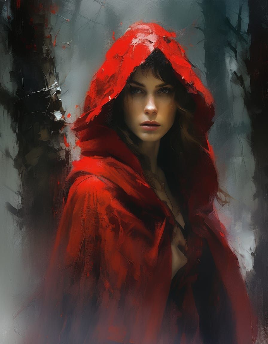 A striking portrait of a woman in a red cloak emerging from shadows in a foggy night forest. Rendered with rough, textured oil paint strokes for a dramatic, fine art look.