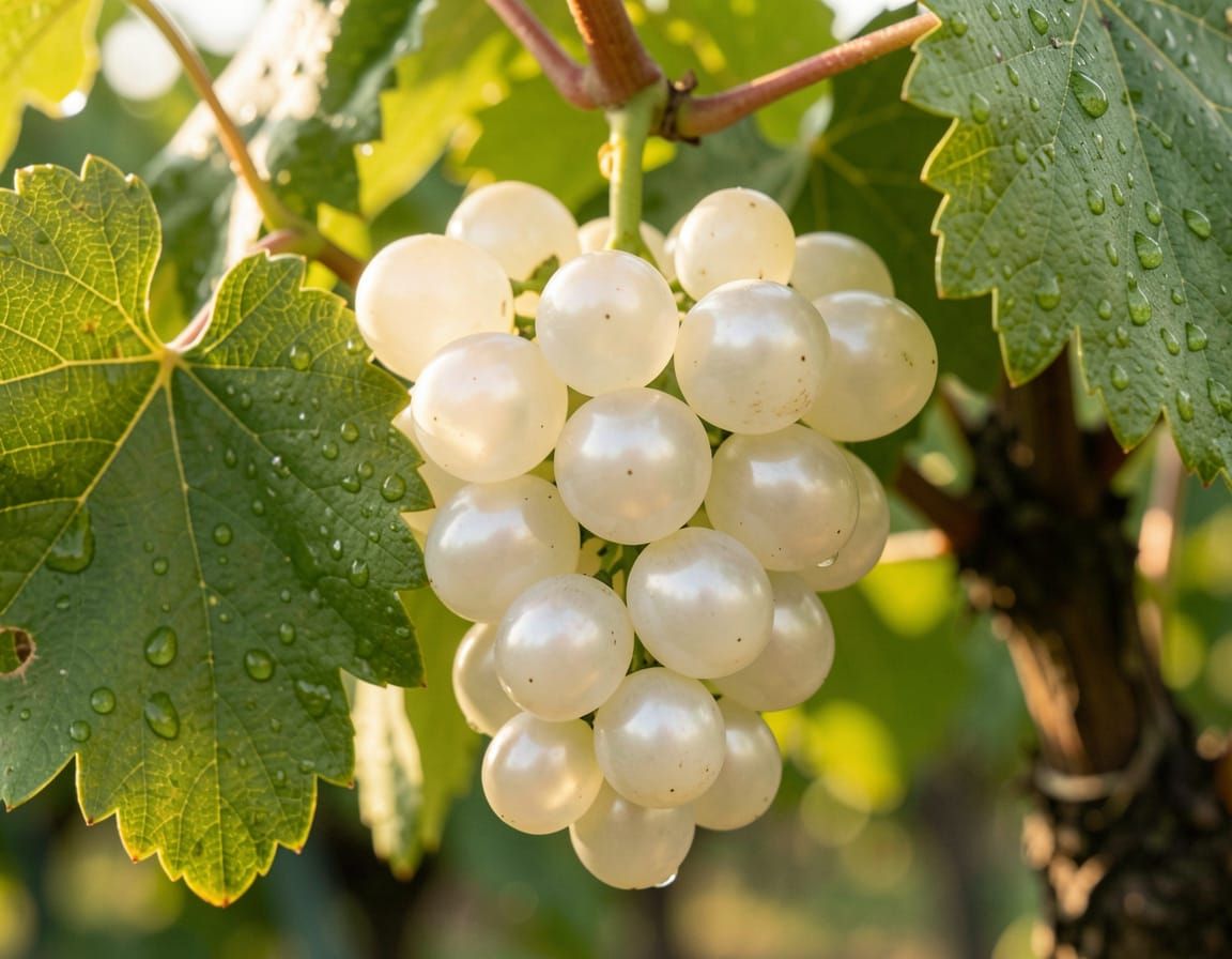 This highly detailed image shows a close-up of white grapes on a vine, covered in water droplets and bathed in soft sunlight, rendered in a realistic style.