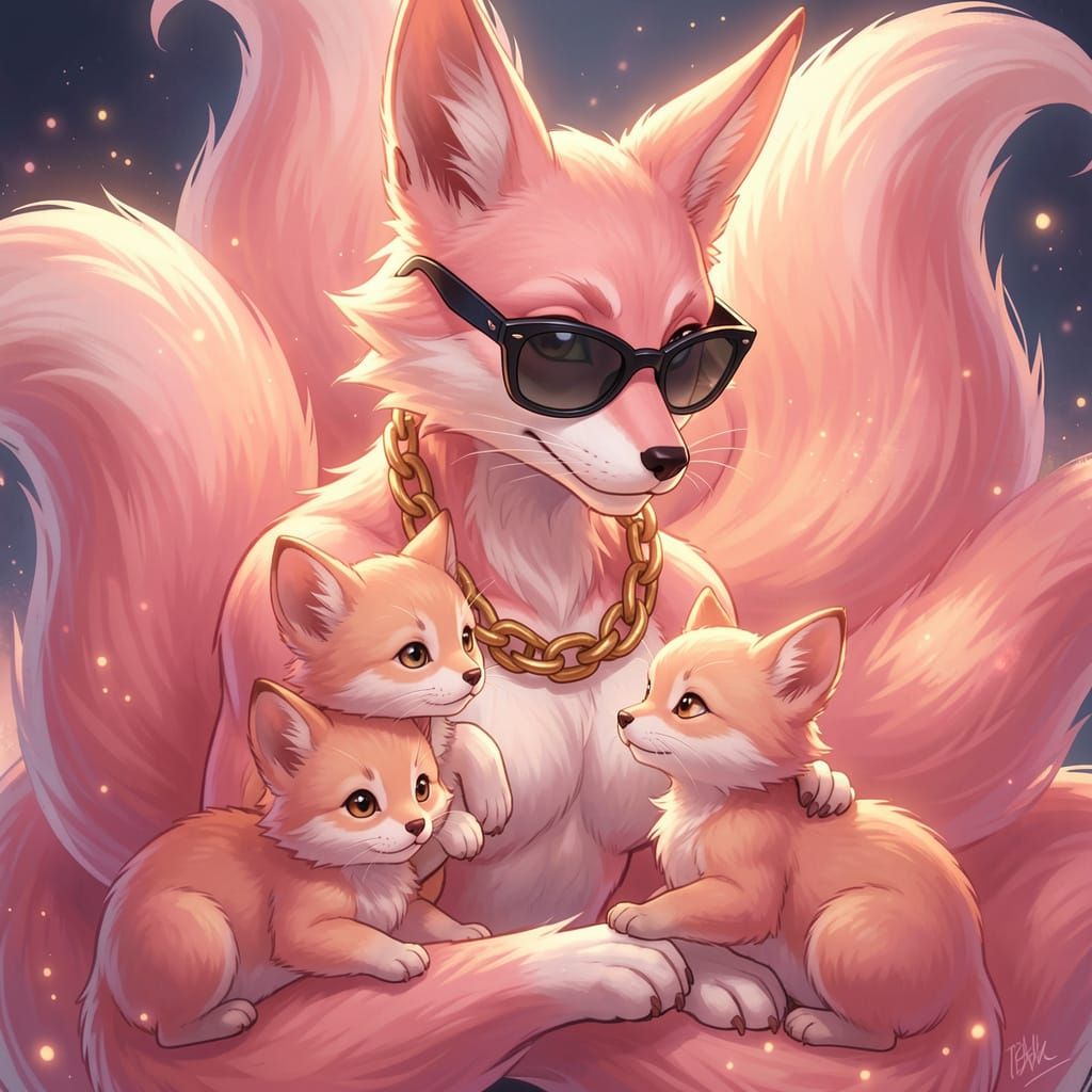 This image depicts a large pink multi-tailed kitsune, wearing a gold chain and sunglasses, intently watching her cubs. Rendered in a vibrant, illustrative fantasy concept art style with warm lighting.