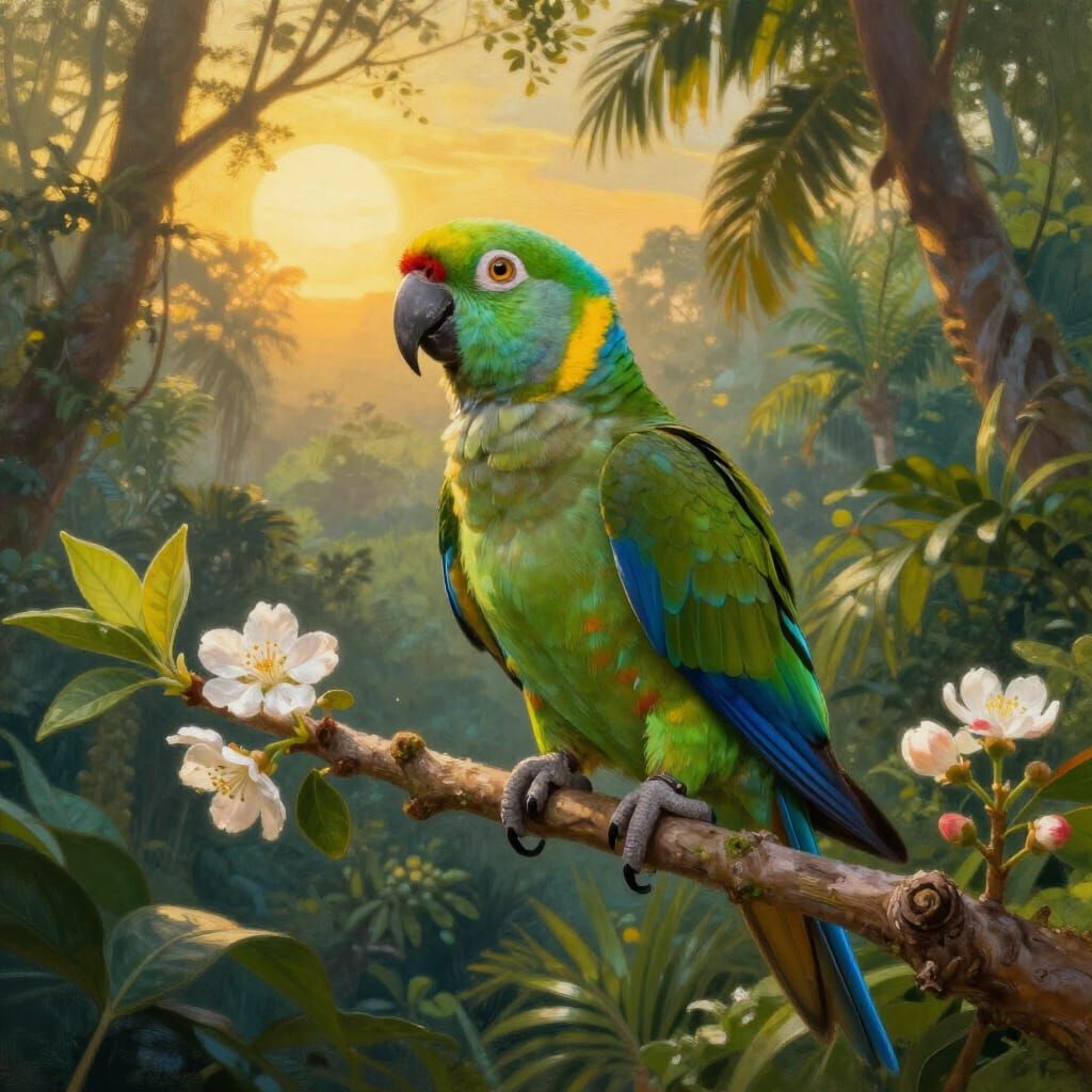 This image shows a hyperrealistic digital painting of an emerald parrot on a flowering branch, looking at a sunrise. The scene features a detailed tropical jungle canopy with rich colors and soft dawn light.