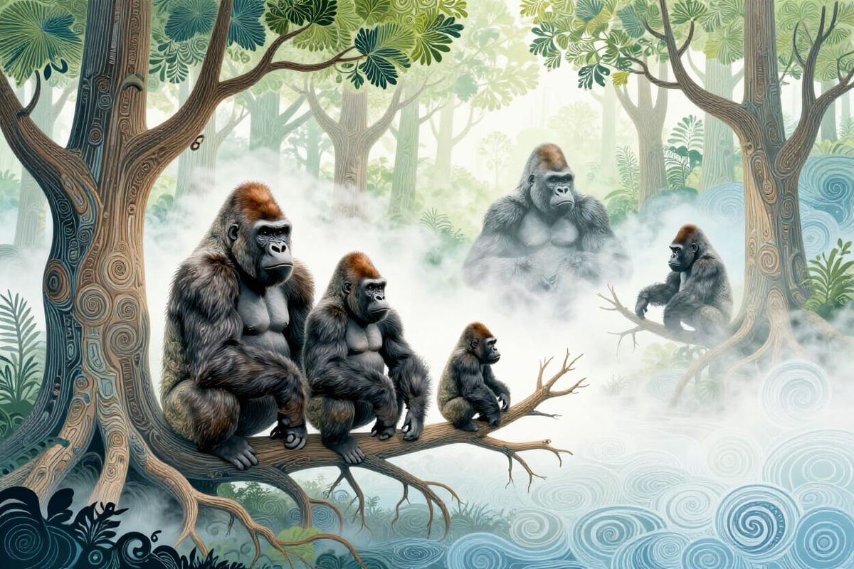 This image shows a surreal jungle scene with five detailed gorillas amidst stylized trees and ornate, swirling mist. The artwork features intricate line art and a vibrant color palette.