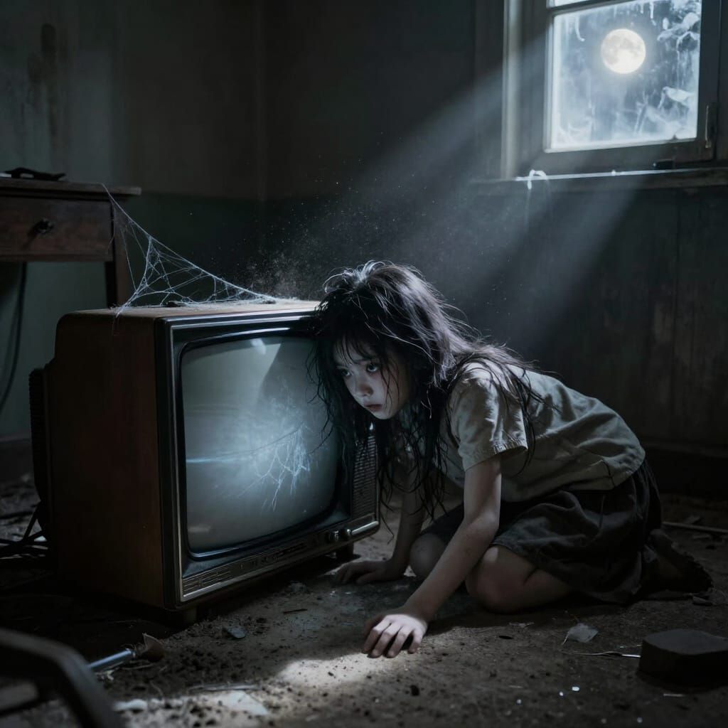 This hyperrealistic image shows a pale girl crawling from an old television in a dusty, cobweb-filled room. Dramatic shadows and moody lighting create a sense of dread and unease.