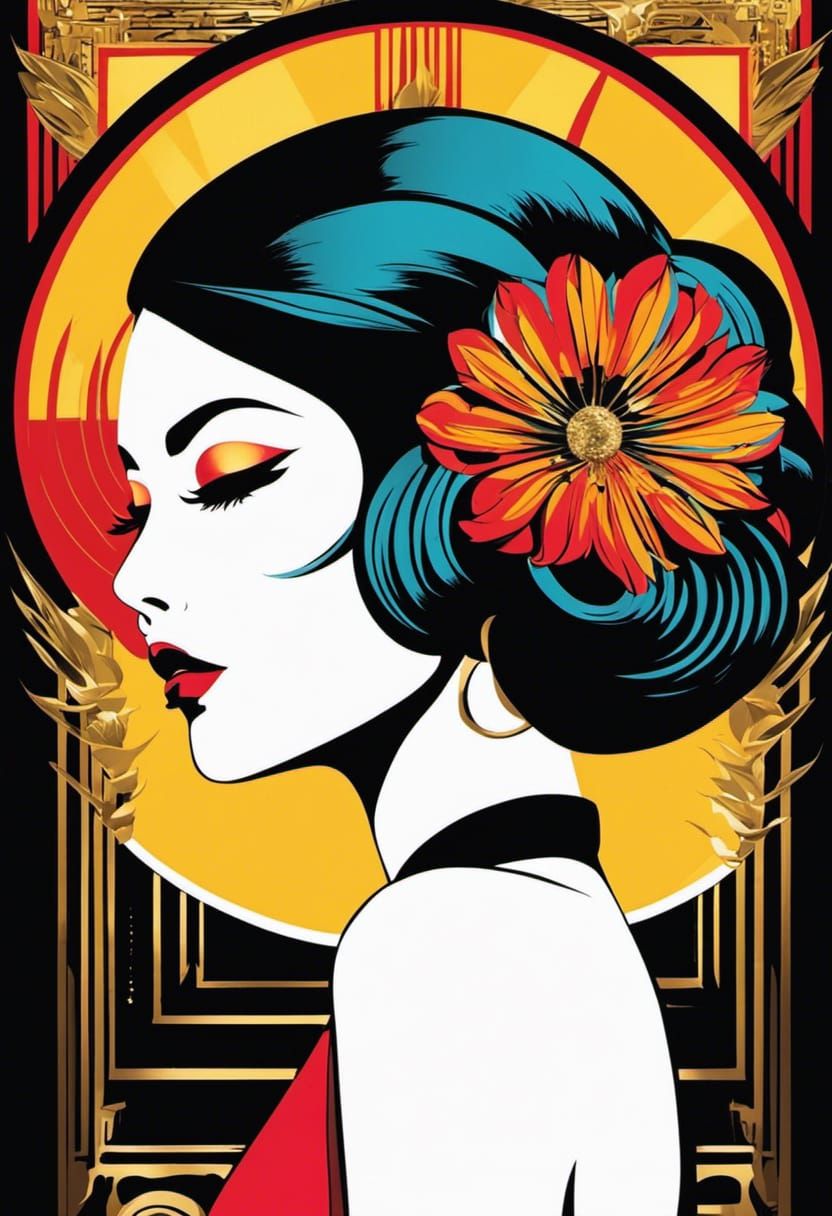 A striking black and white portrait of a woman in the style of Art Deco meets Japanese anime. This image features graphic novel noir art elements with floral accents, presented as digital pop art.