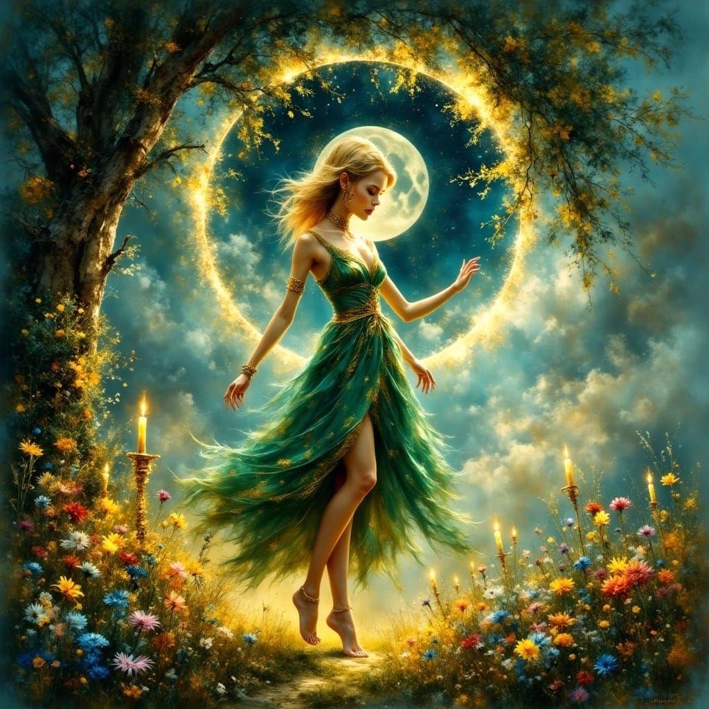 This image shows an elf woman dancing in a flower field during a moonlit Wiccan ritual. The artwork features a fantasy concept art style with intricate detail and deep colors.