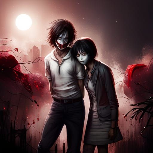 This image shows Jeff the Killer kissing a girl with short hair amidst a scene of carnage. This detailed matte painting employs deep colors and intricate details, reminiscent of fantasy concept art.