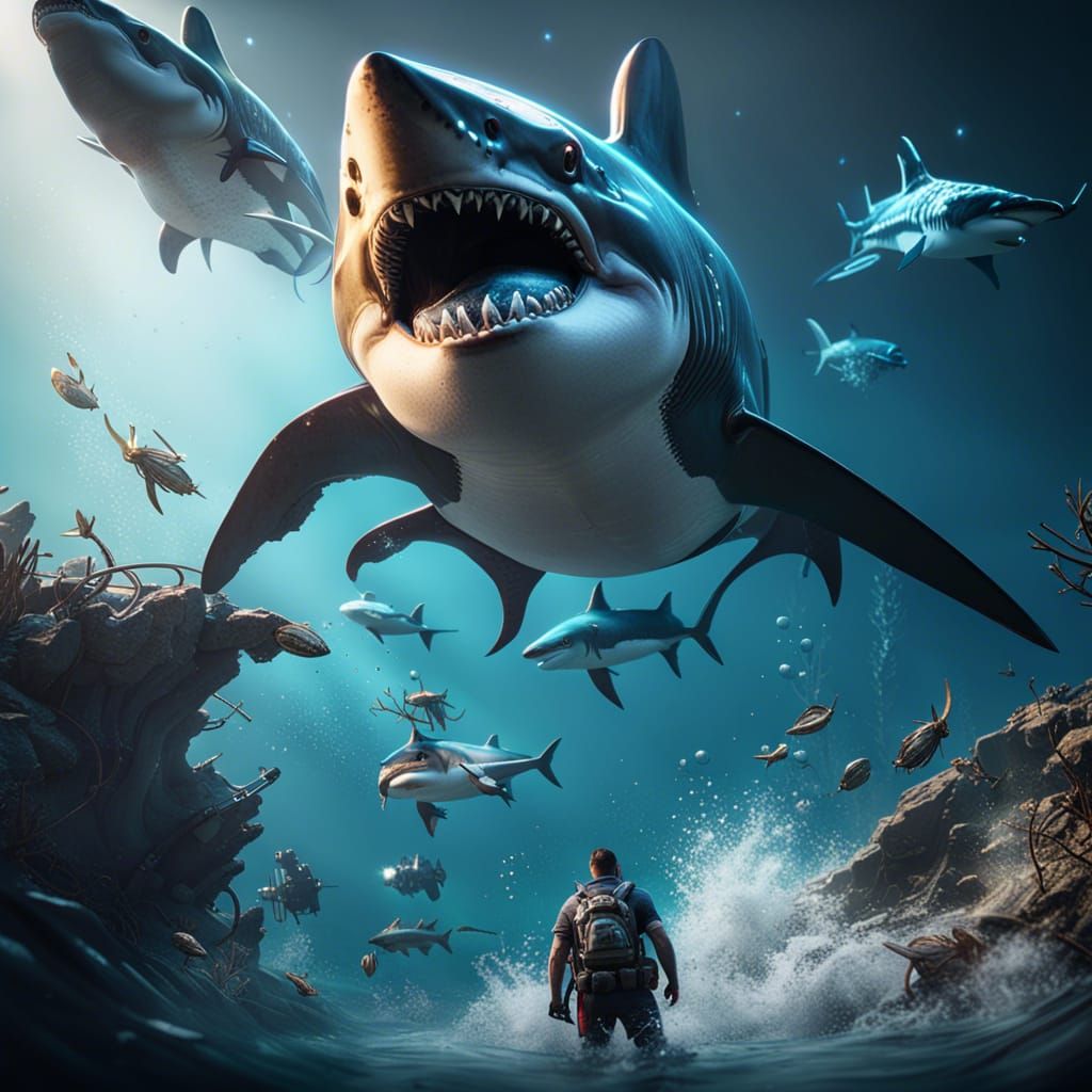This image shows sharks in a dramatic, cinematic scene. The artwork features intricately detailed 3D videogame graphics, dynamic lighting, and a perfect composition.