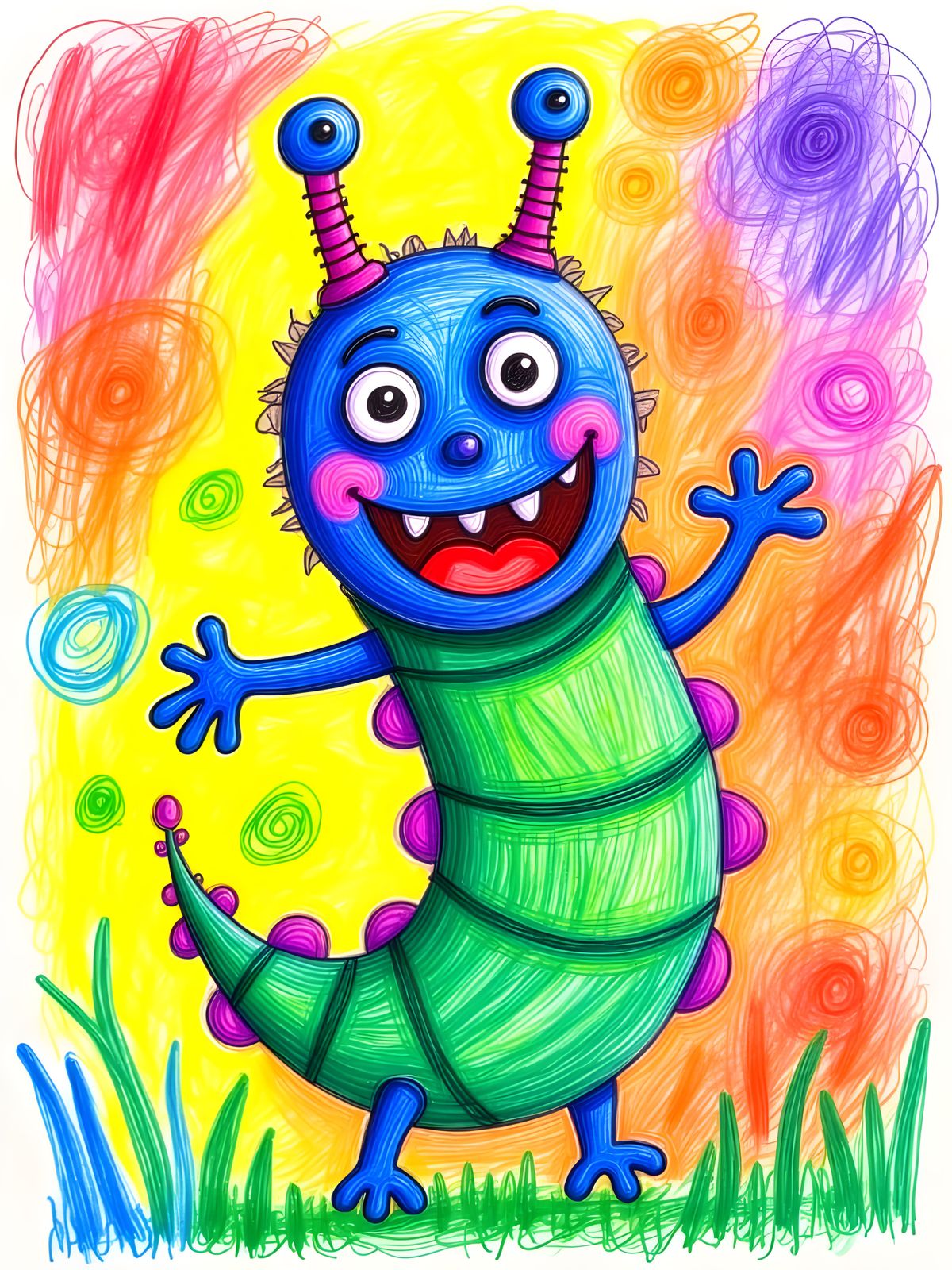 A vibrant and colorful image depicting a whimsical caterpillar dancing with exaggerated expressions, rendered in the style of a child's crayon drawing.