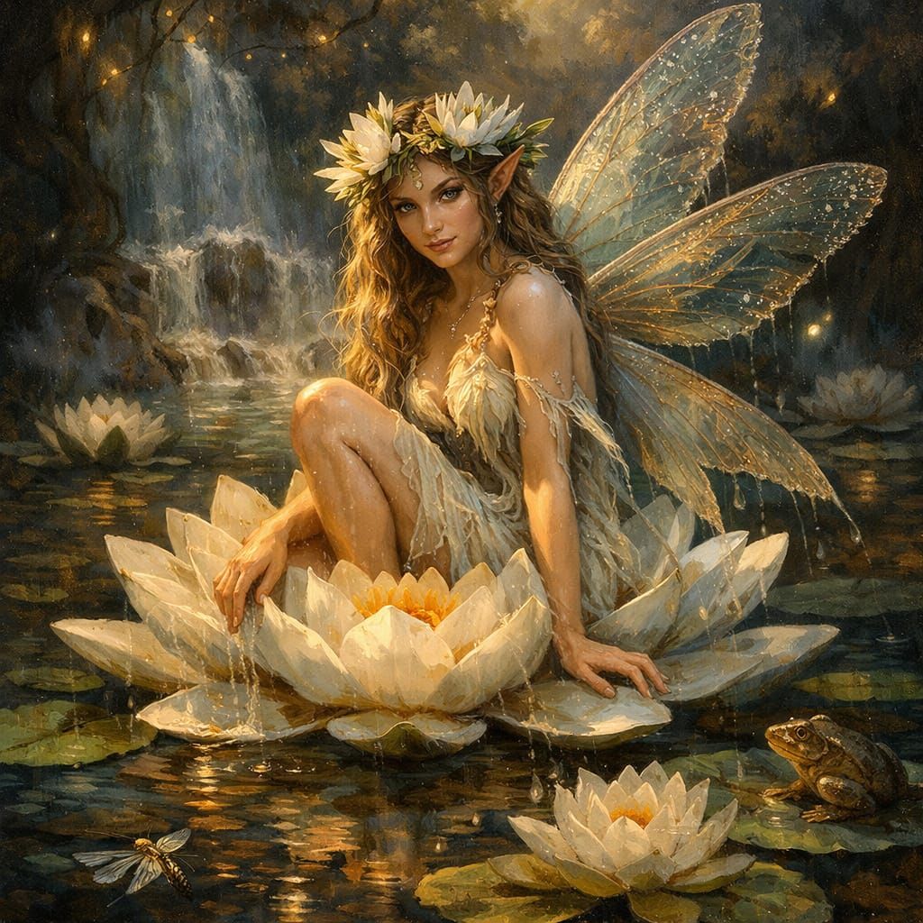 This image presents a detailed and dramatic painting of a Water-Lily Faerie, capturing a magical and ethereal scene with artistic flair.
