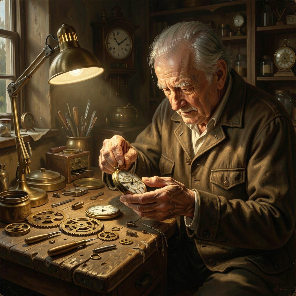 This image shows an elderly clockmaker intently assembling a brass pocket watch in a cluttered workshop. Rendered as a hyperrealistic oil painting with chiaroscuro lighting, it evokes timeless craftsmanship.