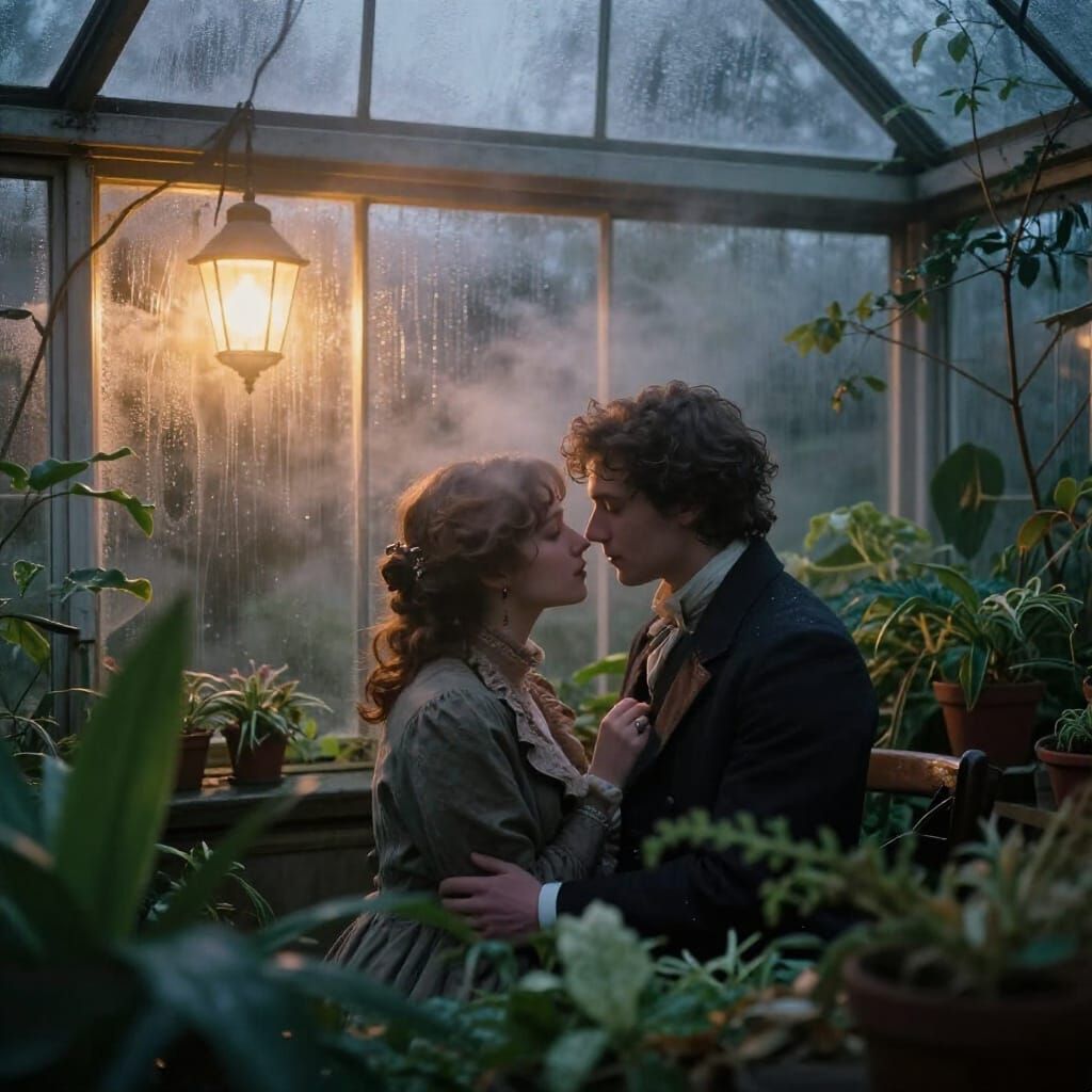 Portrait. Photorealistic twilight scene of two Victorian lovers meeting in a hidden greenhouse, fogged glass panes glowing with warm lamplig...