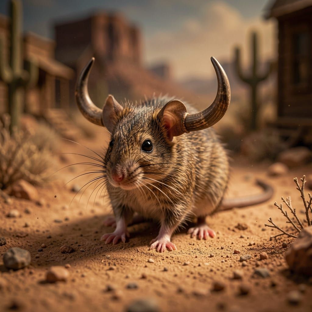 This hyperrealistic image showcases a tiny mouse with bull horns, set against a dusty western landscape diorama. Sharp focus and dramatic lighting highlight its unique appearance.