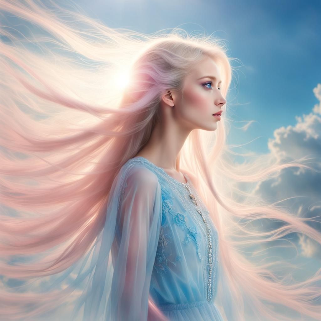 This image shows a figure with very long hair, thin lips, a pink face, and small blue eyes, wearing a short, transparent dress. The scene is illuminated by heavenly sunshine beams.