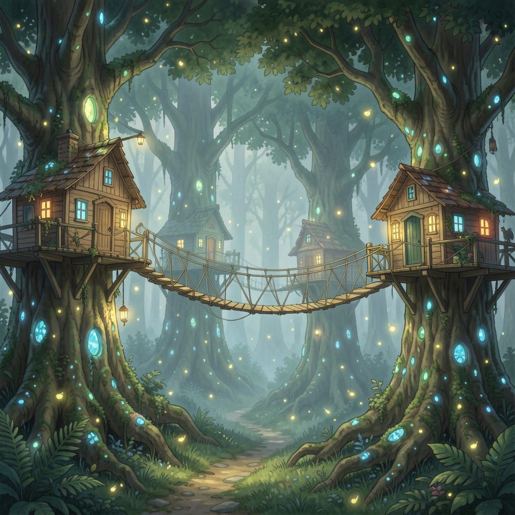 A magical treehouse village set in an ancient, glowing forest. Rope bridges connect homes built into giant trees, illuminated by fireflies and cinematic lighting.