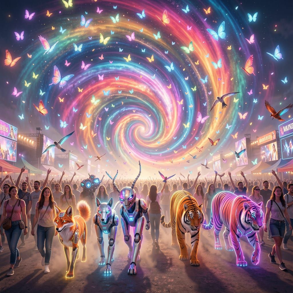This image shows festival-goers with cybernetic animals like glowing foxes and neon tigers, surrounded by a hypnotic vortex of colorful, glowing butterflies.