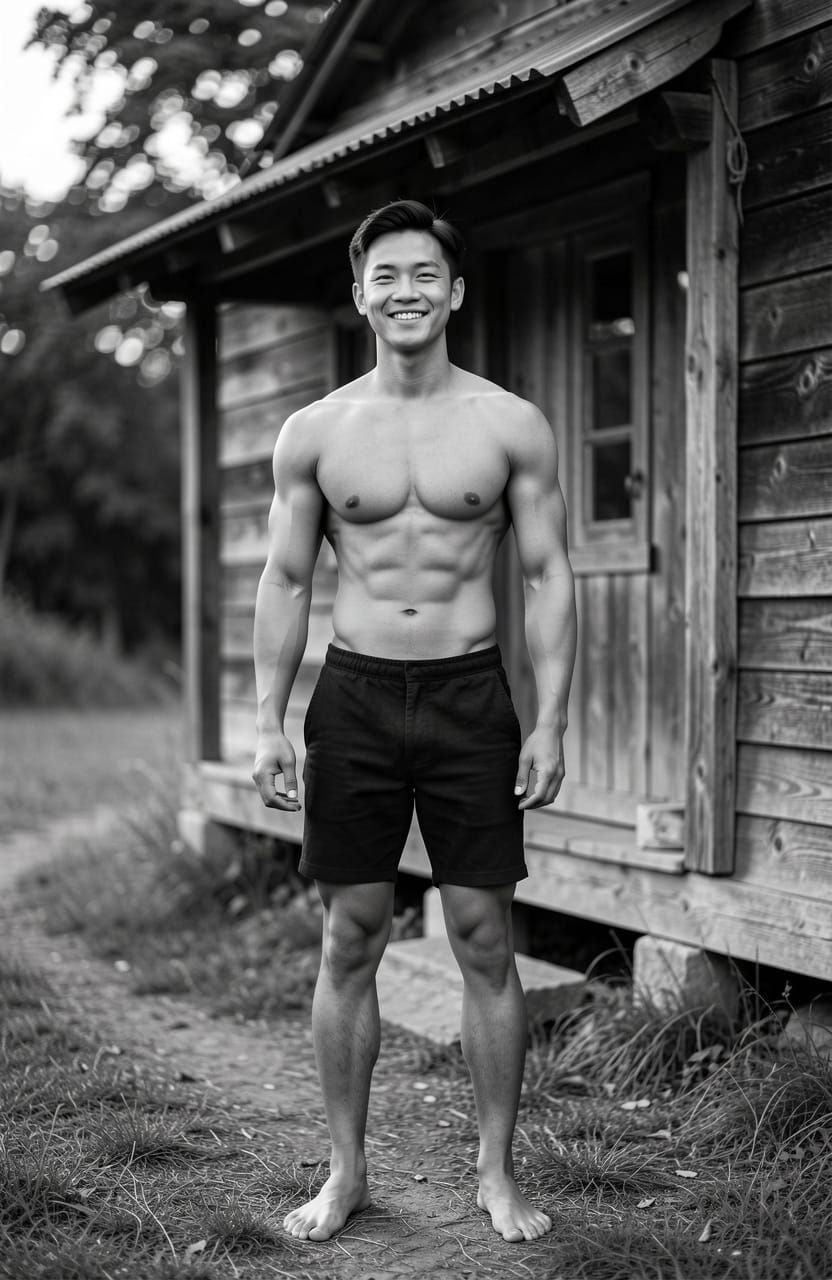 This image shows a happy, suntanned young man standing shirtless by a wooden cabin. Rendered in photorealistic black and white with natural lighting, it features ultra-detailed physique and a peaceful rural setting.