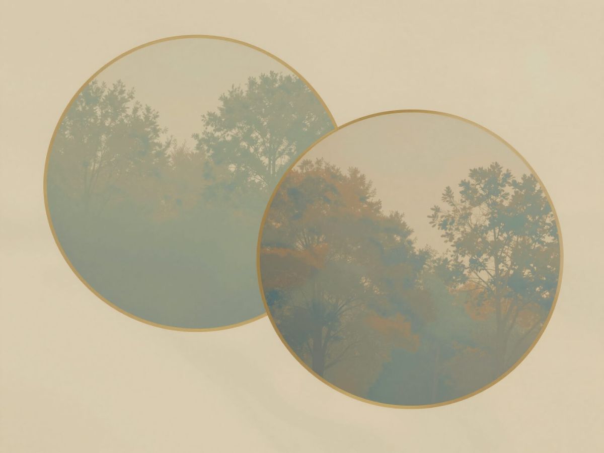 This image showcases silhouettes of trees within overlapping circles, rendered in warm, muted tones with gold accents against a subtle marbled background, creating a dreamy, ethereal feel.
