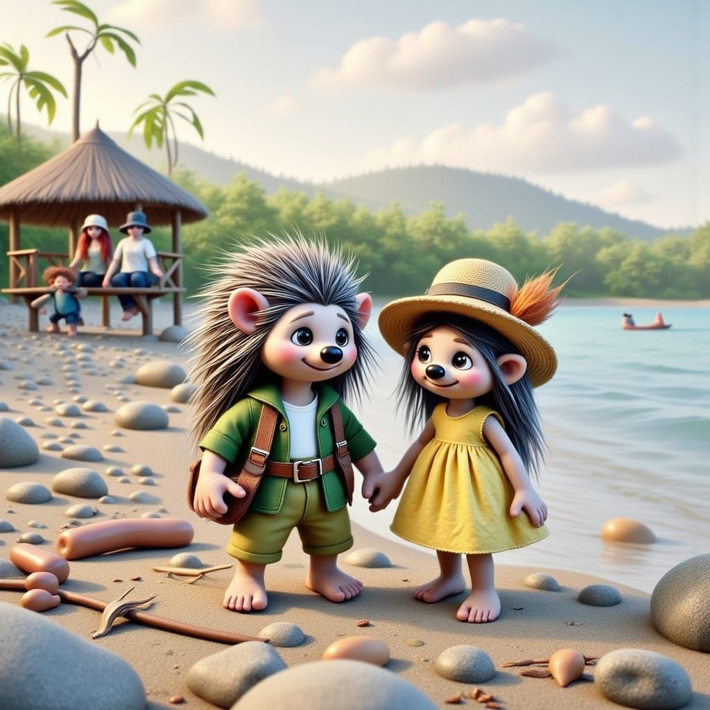 This image shows two hedgehog puppets with human-like faces and real spines for hair, adventuring in the jungle. Captured in a warm, nostalgic handmade puppet film aesthetic with soft lighting.