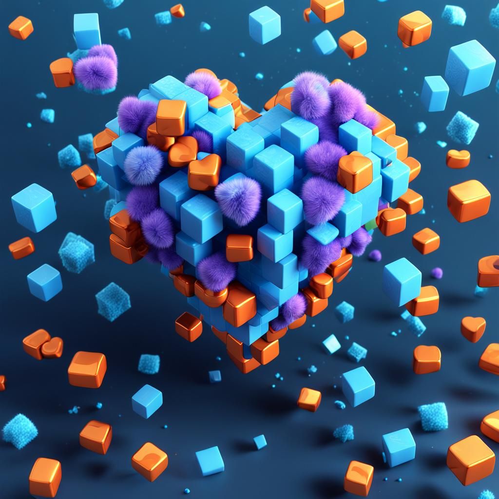 This image shows a fluffy cerulean heart with "Thank You" on it, surrounded by cosmic cubes. Rendered with Cinema 4D and Octane, it has a cinematic, illustrative style.