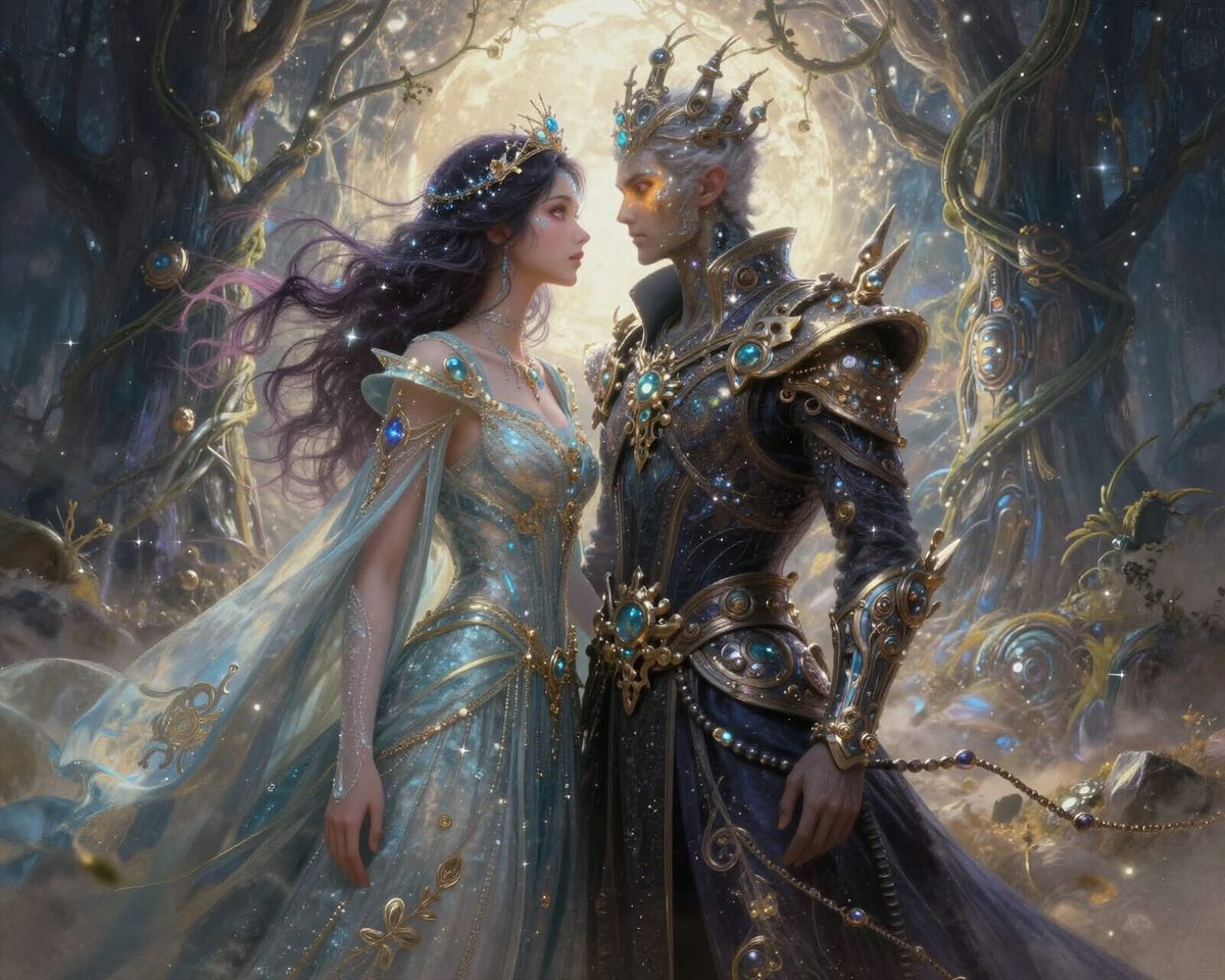 This image shows a hidden grove bathed in moonlight, featuring a princess and a stardust celestial being. The artwork blends hyperrealism with a dreamlike fantasy concept art style.