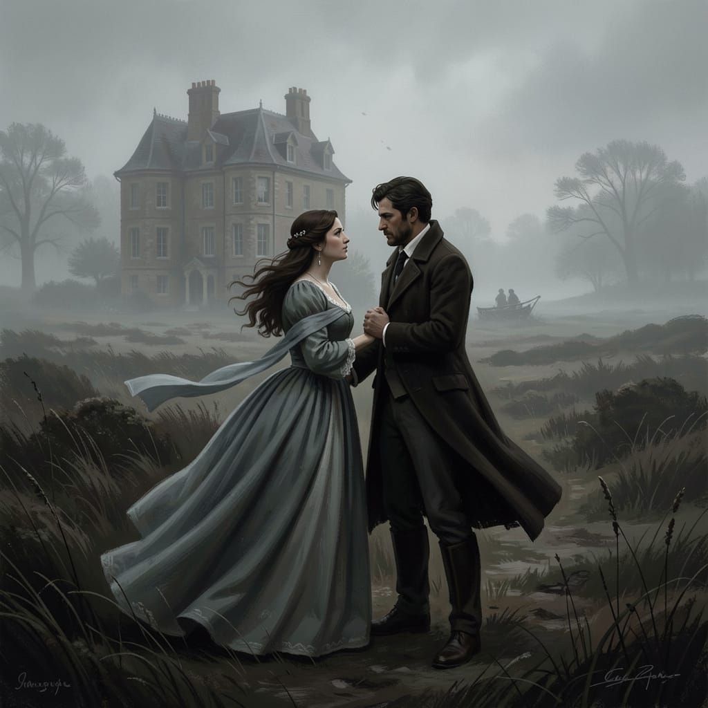 This image depicts a secret meeting between lovers from different social classes on a foggy moor, with a tense confrontation outside a secluded manor. It is rendered in a cinematic digital painting style with dramatic lighting and a desaturated, melancholic color palette.