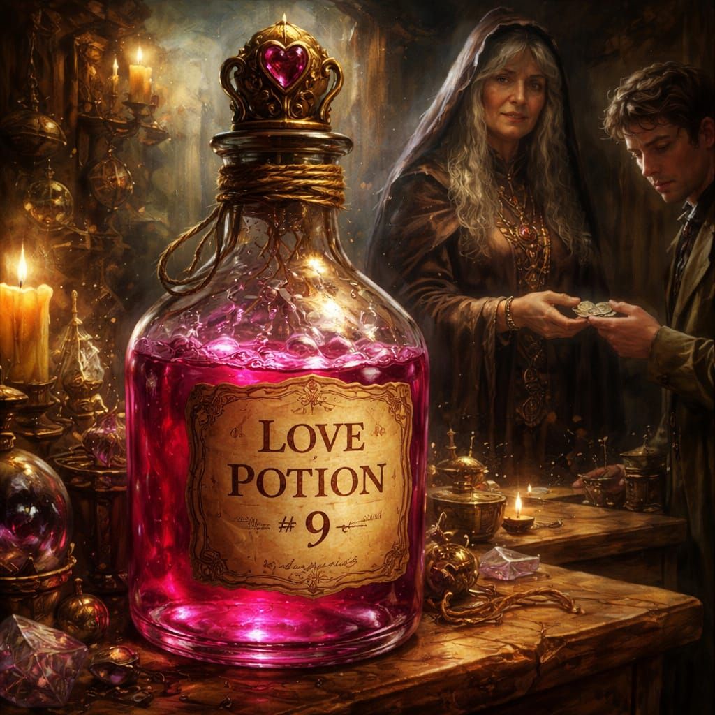 This image shows a close-up of an antique bottle labeled 'Love Potion #9' on a cluttered counter. Dramatic lighting highlights the scene in a hyperrealistic oil painting style.