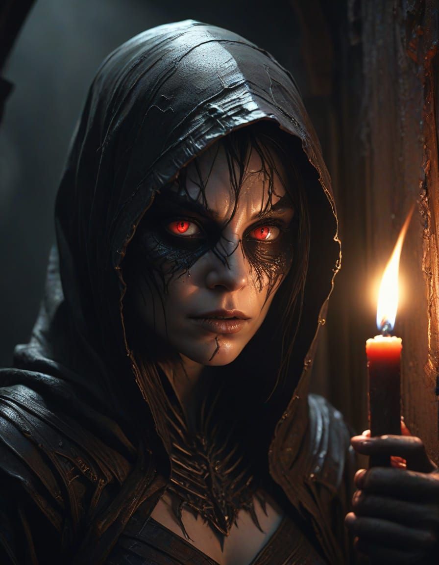 This dark, eerie portrait features a close-up of a female shadow fiend with glowing red eyes and sharp claws, set against a backdrop of flickering candles, cracked walls, and cobwebs, all rendered in hyperrealistic detail with a focus on texture and atmosphere.