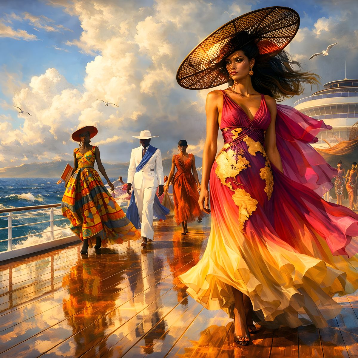 A vibrant scene of a global fashion show on a cruise ship deck, featuring dynamic movement and stunning attire. Inspired by luminous landscape art and bold contemporary installations.