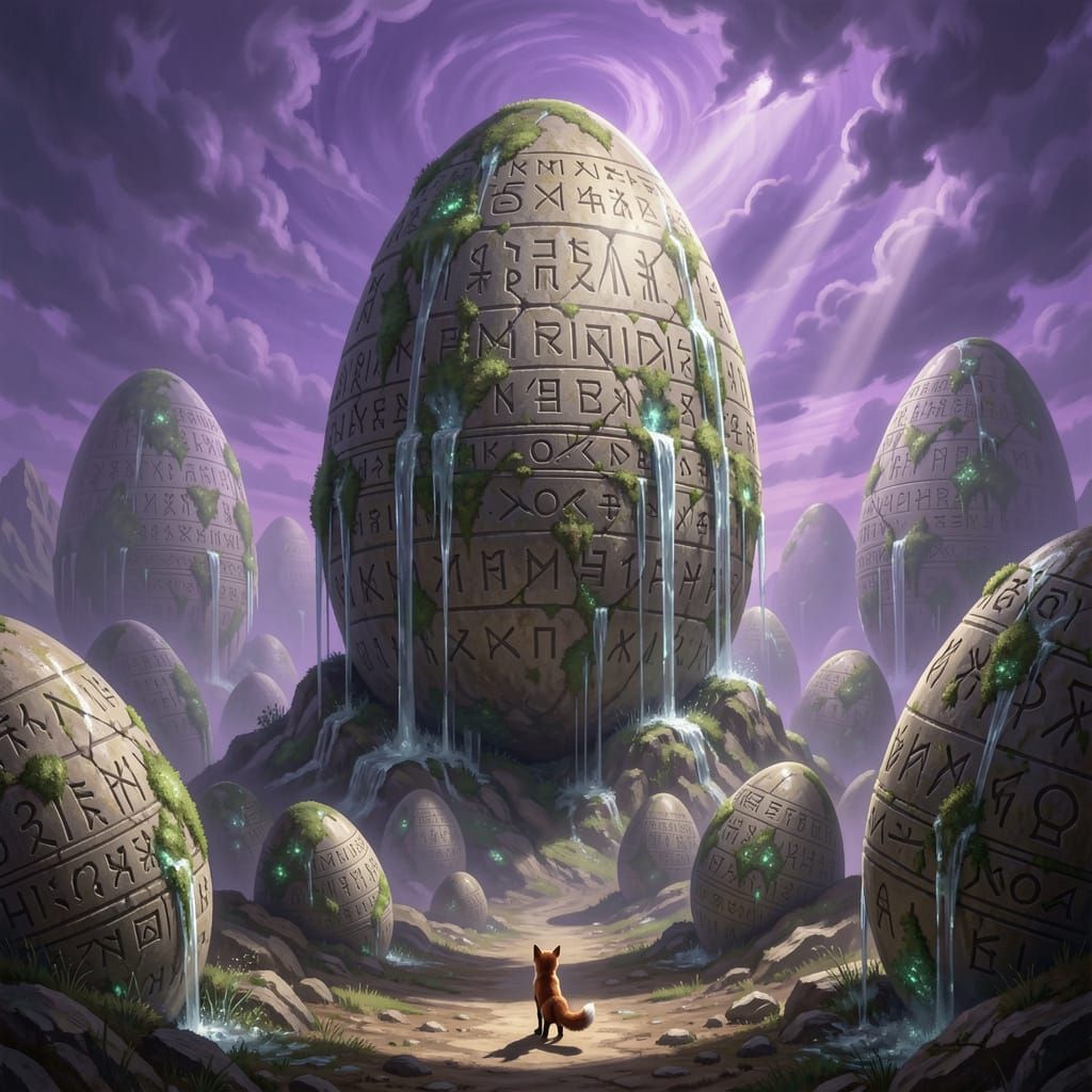 This image showcases a colossal mountain range formed from giant, carved stone Easter eggs, illuminated by god rays. A tiny fox observes the grandeur below.