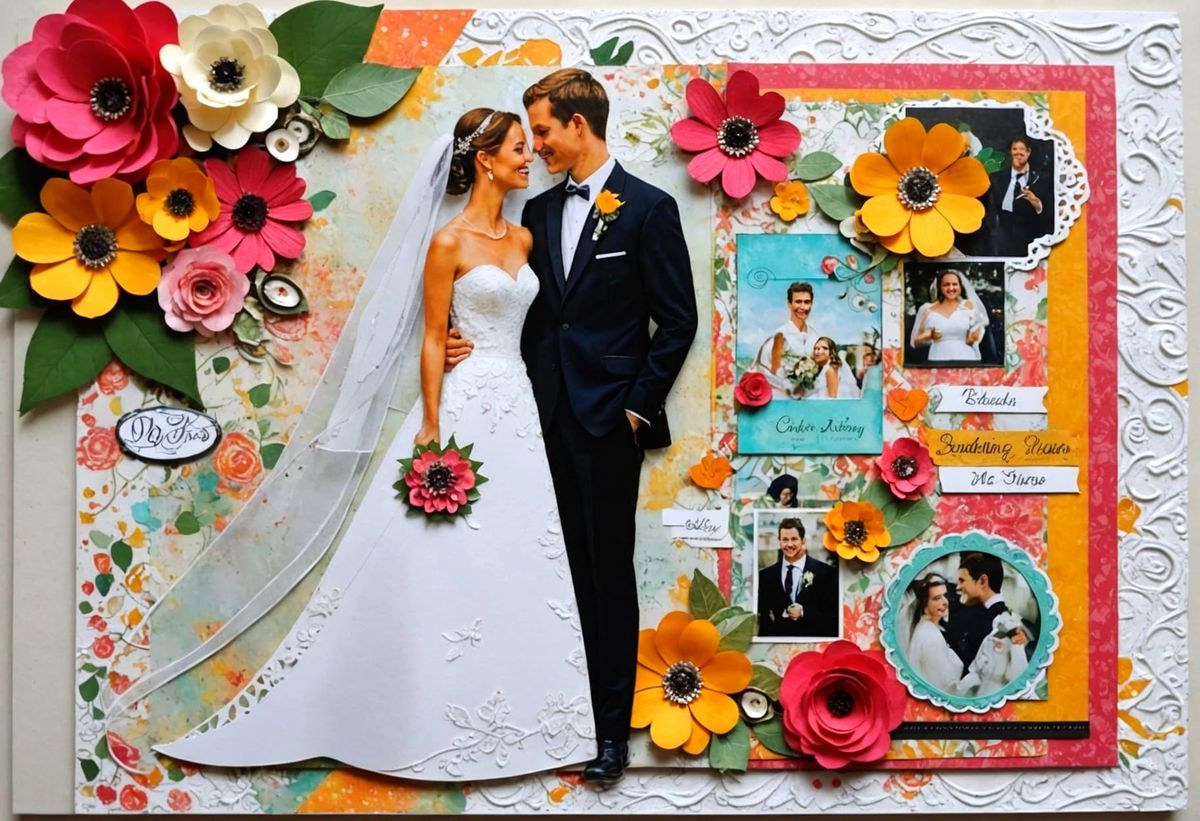 This vibrant scrapbook page captures a wedding couple in a mixed-media style, filled with colourful textures and artistic elements.