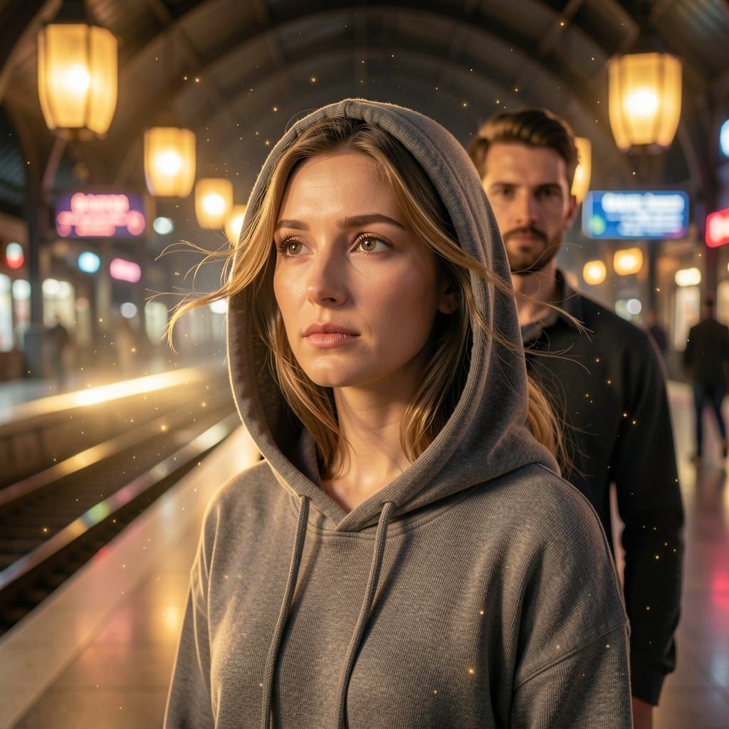 This ultra-photorealistic portrait shows a woman in a magical train station at night. Lit by lanterns, her face shows tenderness and hope. A hidden lover stands behind her, with cinematic bokeh and warm colors.