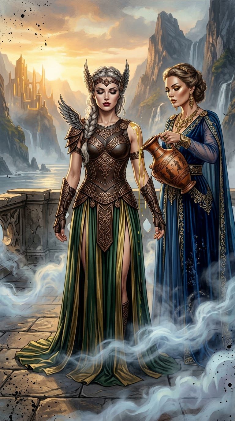 This fantasy concept art shows a Valkyrie receiving an anointing from her mistress, with ethereal mist swirling around them. Features cinematic lighting and fine art detail.