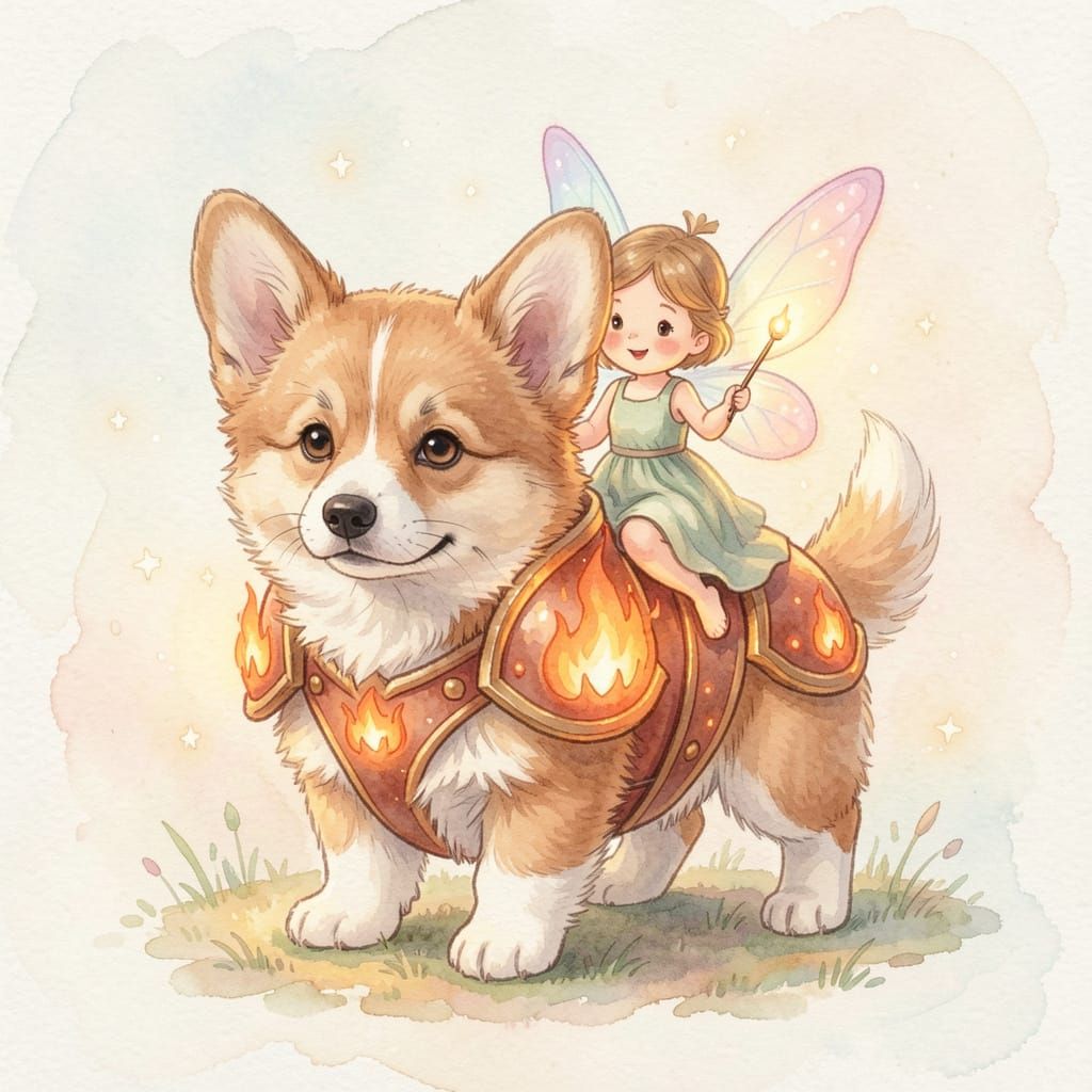 This image shows a fluffy corgi dressed as a fire warrior, carrying a fairy. Painted with delicate watercolor textures and warm colors, it evokes a dreamy fantasy atmosphere.