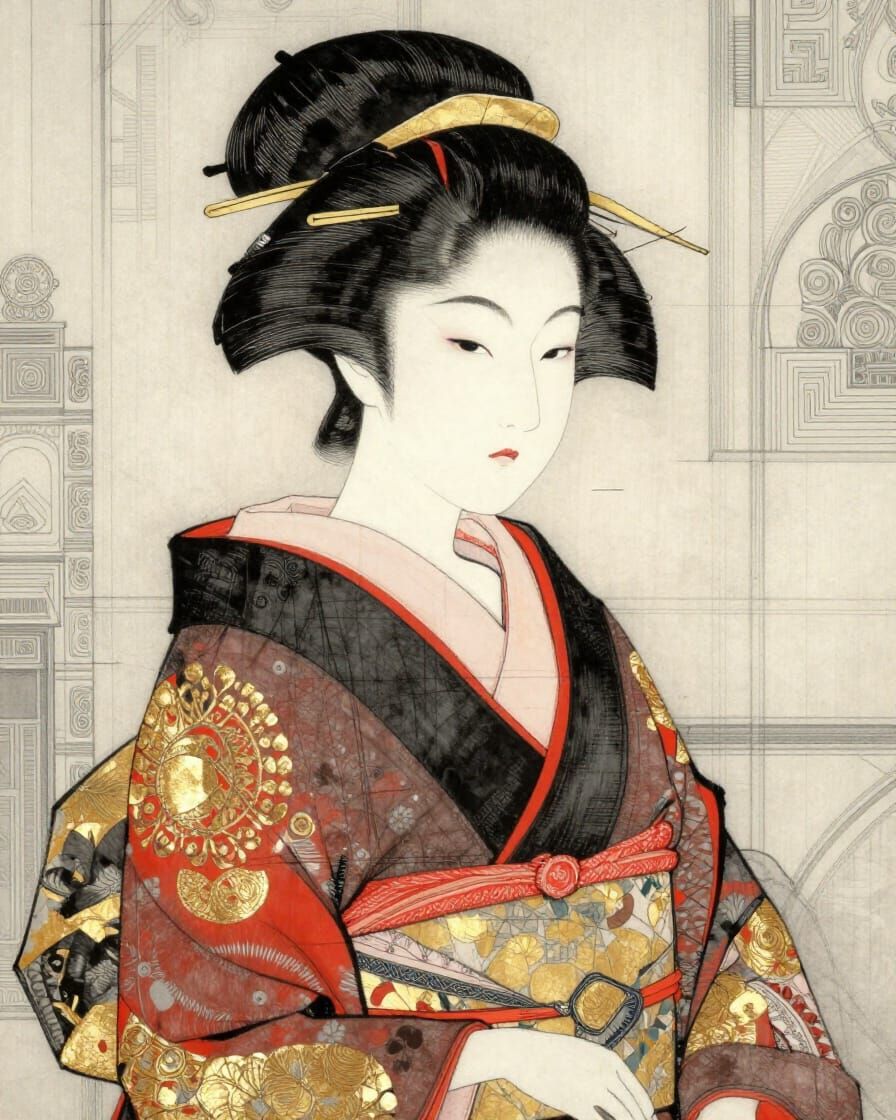 A stylized illustration of a geisha in a patterned kimono, featuring bold graphite lines and selective gold and red paint. The background has abstract ornamental elements and visible sketch marks.