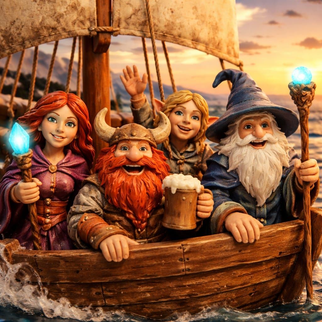 This claymation image shows four adventurers on a ship, returning home after a successful quest. The artwork is in a stop motion style, capturing a moment of triumph.