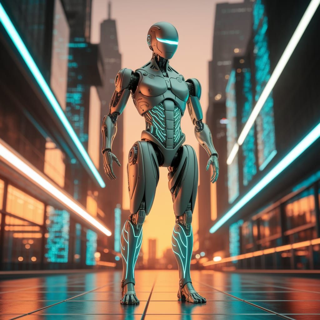 A humanoid figure composed of circuitry and glowing energy lines stands amidst a bustling futuristic city at dusk, surrounded by neon lights and towering skyscrapers, in a scene blending urban architecture and digital holograms.