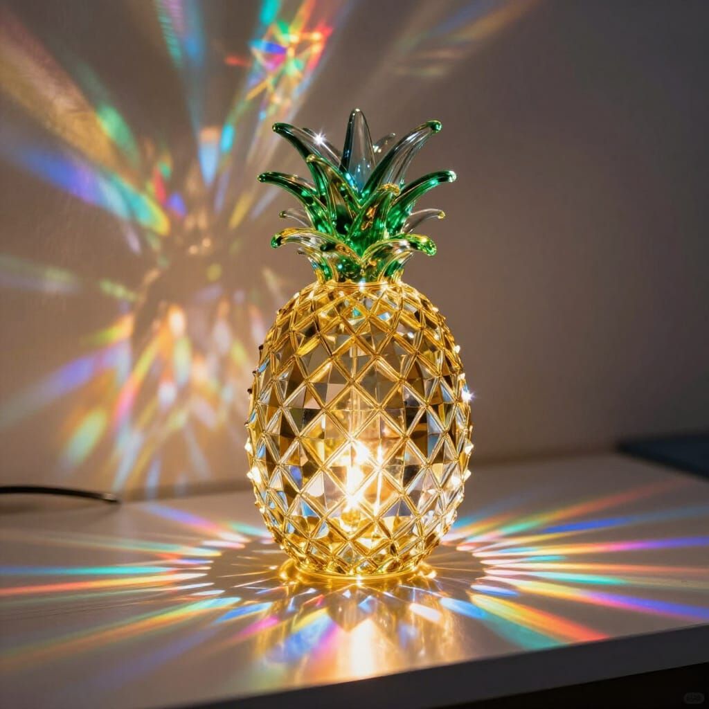 A hyperrealistic image showcases a glass pineapple disco lamp on a DJ table, casting vibrant rainbow patterns. Focuses on exquisite glass sculpture and optical properties.
