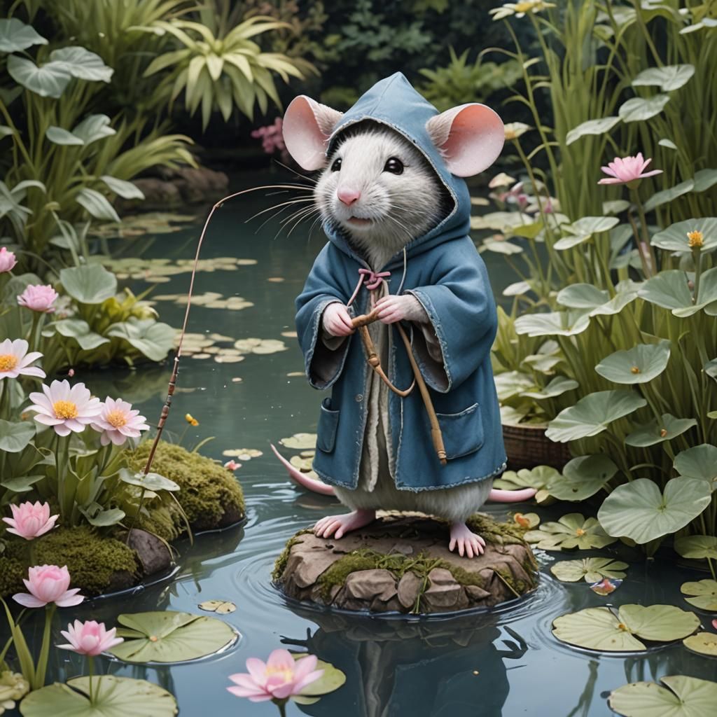 This photorealistic image shows a small mouse in a blue hooded cloak fishing in a tranquil garden pond. It captures intricate details of fur, fabric, and flowers in a serene, fairytale setting.