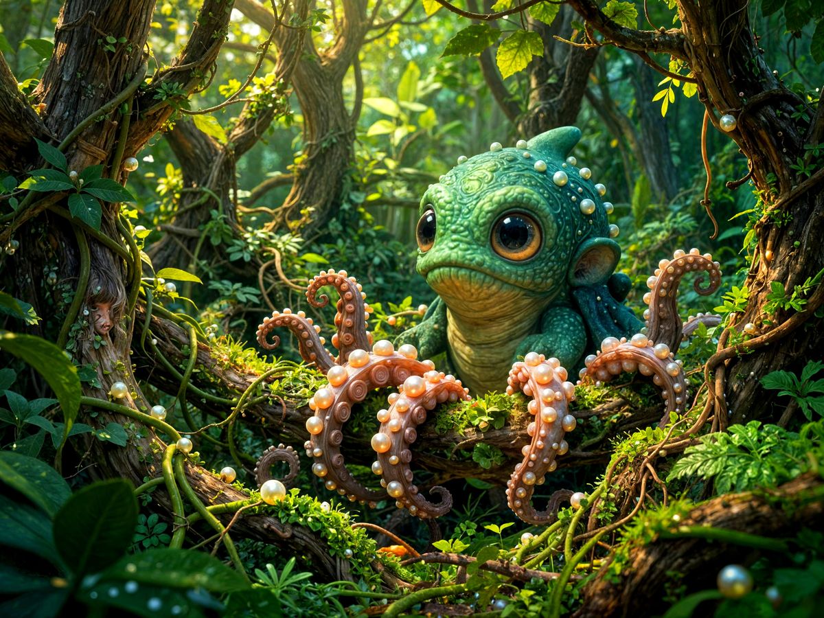 This image shows a baby Kraken with innocent eyes and small tentacles trying to escape a vibrant, overgrown maze of enchanted vines, with phosphorescent pearls adorning its limbs. The style is detailed with natural textures and saturated colors.