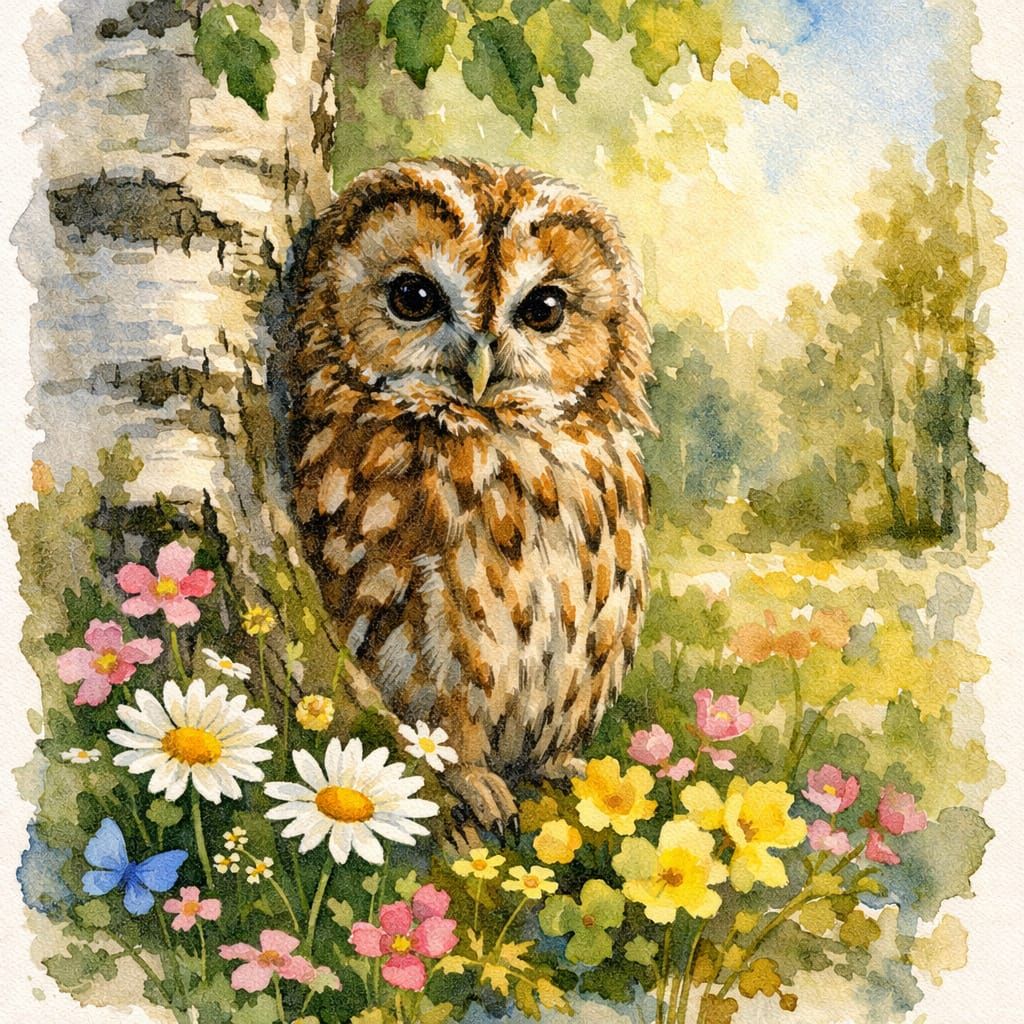 A close-up realistic watercolor of a tawny owl perched in a birch tree. The scene features a sunny spring morning with colorful flowers, rendered with slightly uneven edges.