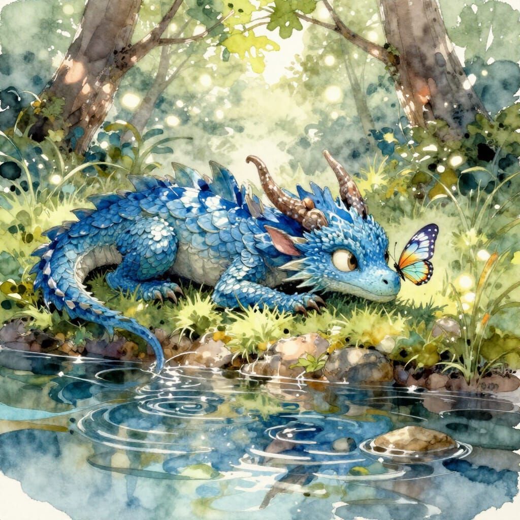 This image shows a small blue dragon with leaf-like scales by a stream, with a butterfly on its nose. It is rendered in a loose, expressive watercolor and alcohol ink style with vibrant colors and bleeding edges.