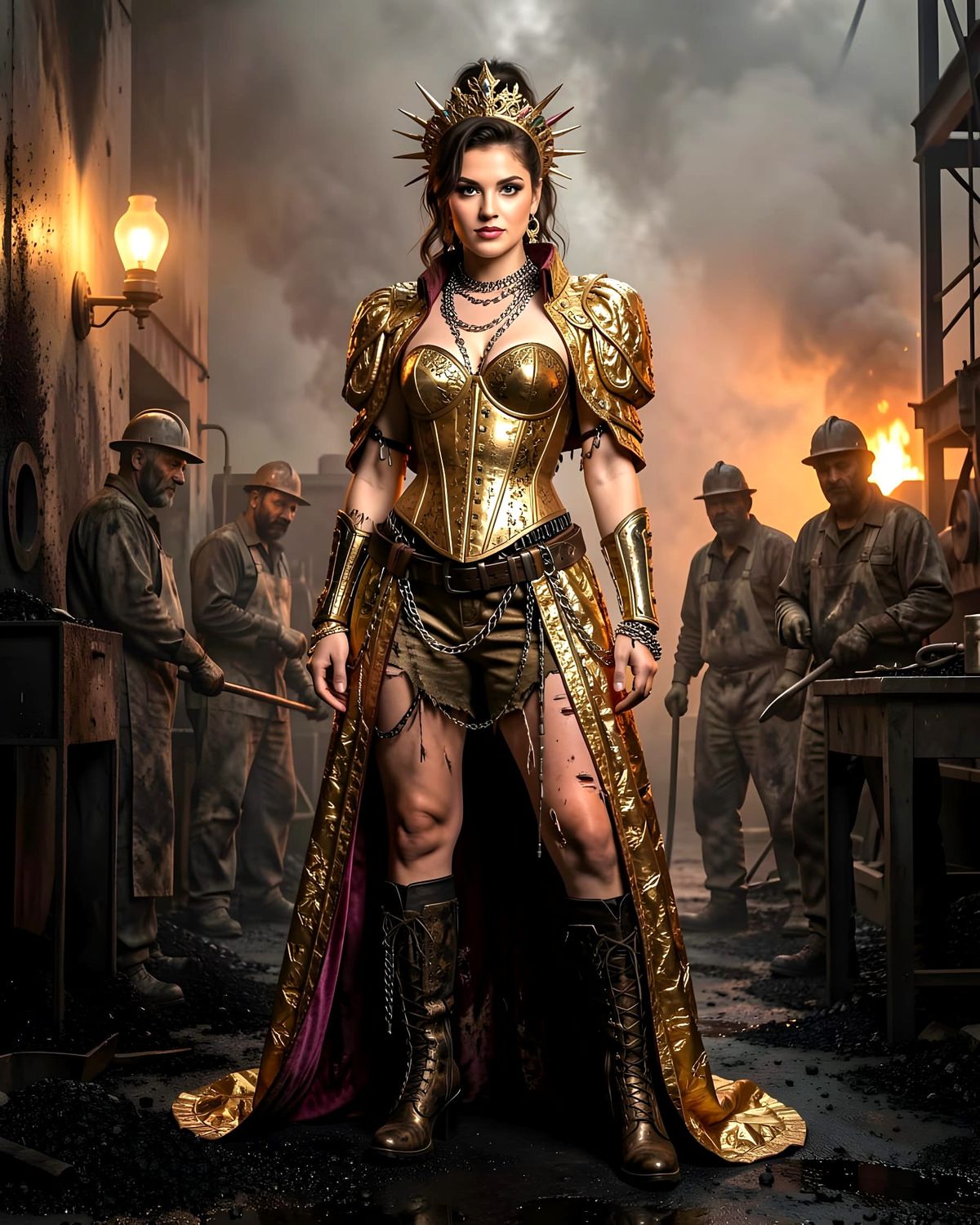 This image depicts a striking fusion of baroque opulence and punk rebellion. A woman in 19th-century attire is adorned with gold leaf, chains, and leather against a gritty, industrial backdrop.