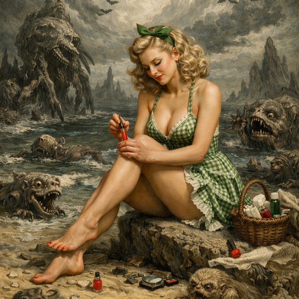 This hyperrealistic painting depicts a pin-up figure with red nails on a bizarre beach. The art style evokes the dramatic and detailed aesthetic of Gustave Doré, featuring unusual creatures.