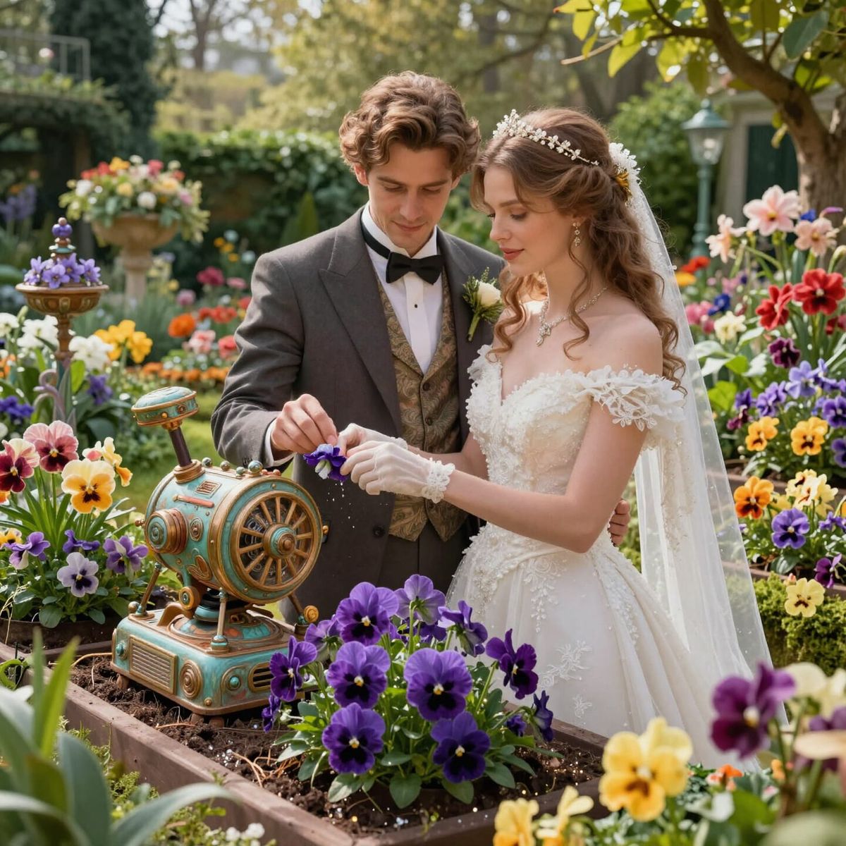 A Magical Garden, maintained by small machines instead of sunlight and soil, the garden is watched over by a beautiful young married couple, the garden is magically decorated with various flowers, and a flowerbed with a Purple pansy plant . head and shoulders portrait, 8k resolution concept art portrait ...