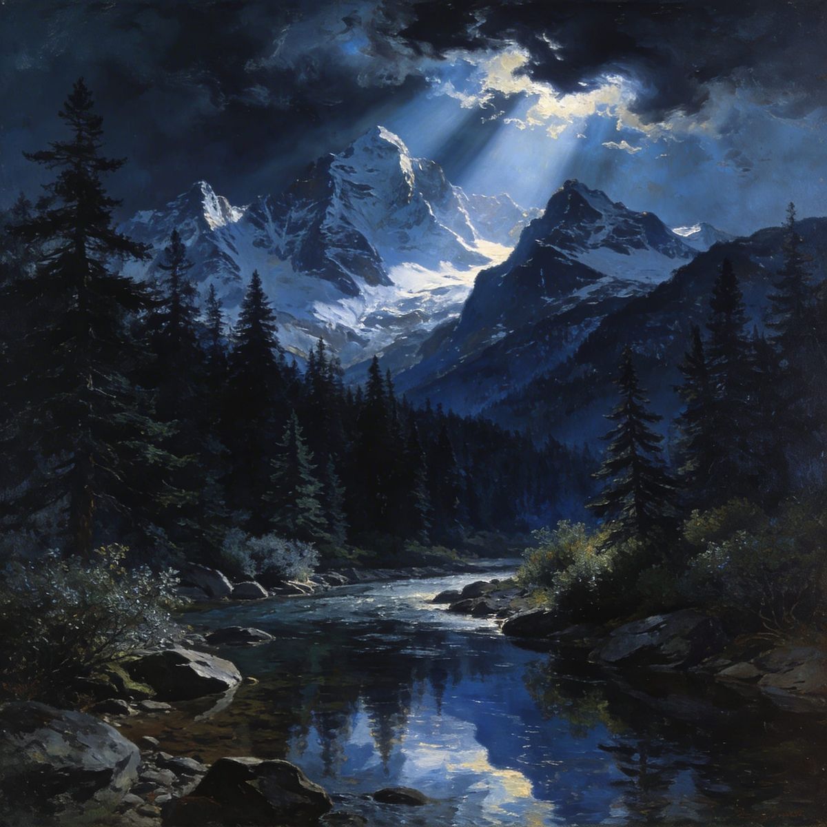 Oil painting of a dramatic, mountain range, partially snow-covered in shades of deep blue and black, under a stormy sky with shafts of sunlight breaking through. The foreground features an intricately detailed deep woods fir forest and a rocky river reflecting the sky, with surrounding fir trees and ...