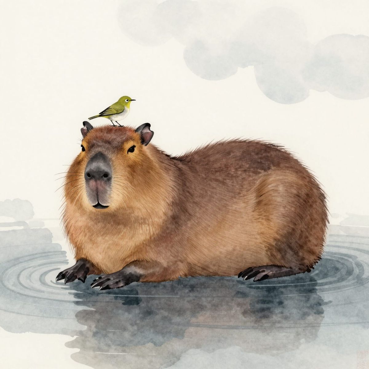 This image shows a single capybara in a tranquil Zen brush painting style. The artwork features gentle tonal washes and a calm, contemplative expression, evoking exquisite peace.