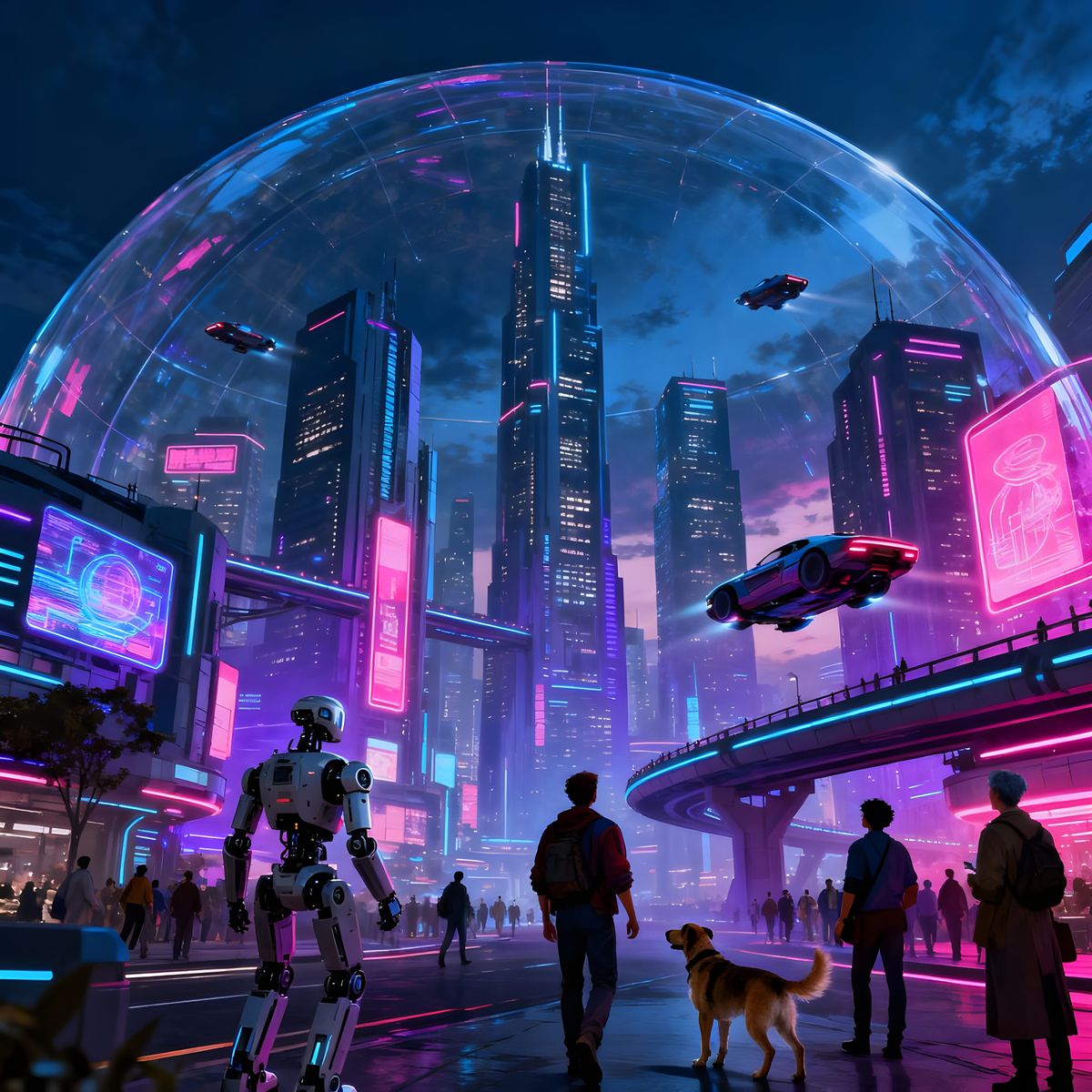 This AI-generated image depicts a sprawling, technologically advanced city enclosed within a transparent dome. It showcases a harmonious blend of robots, humans, and even a canine companion living together in a futuristic environment.