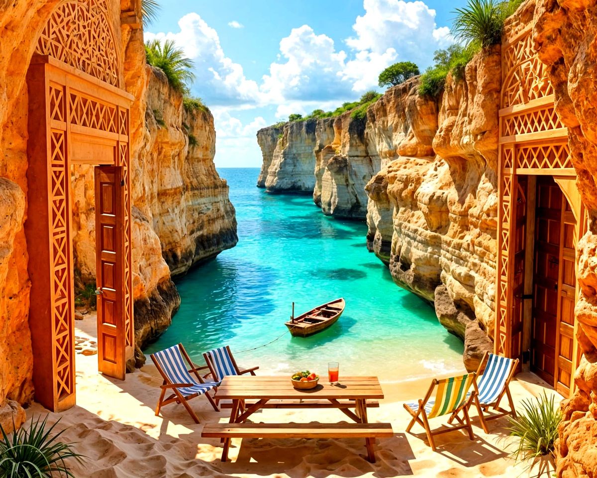 This image showcases a sun-drenched Swahili shore with a turquoise inlet framed by a coral gate. Intricate geometric carvings adorn white sand beaches and cliffs, rendered in a vibrant, layered color palette.